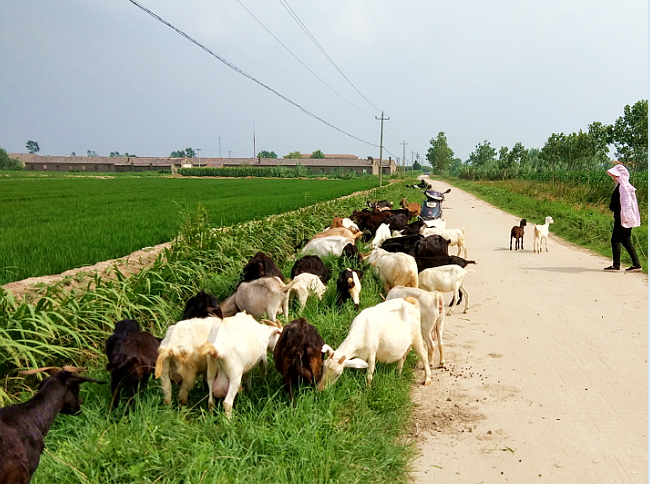 淮海農場四分場社區三十大隊養殖戶曹正紅瞄準市場上養殖山羊可快速致富的有利時機,利用農場社區農田溝河灘地多的優勢,通過滾雪球式的自繁自育和看護散放的低成本做起,連續多年養殖波爾山羊,并且每年的養殖規模控制在適合一人管護的100頭左右。由于曹正紅一直以來堅持人工看護、戶外散養,以飼喂青草為主,養殖的山羊不但膘肥體壯,野味足,相應食用口感好。每年曹正紅除能繁母羊、配種公羊和幼羊外,其余的均被熟識的周邊客戶和飯店訂購一空,走出了一條特色養殖和勤勞致富的新路子。圖為曹正紅的家人正在路旁散放山羊時的鏡頭。