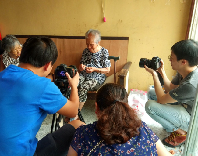 當(dāng)天一整天,澎湃新聞采訪組一行圍繞老人的生活起居活動,以紀(jì)實(shí)的手法全程展開。凌晨5點(diǎn)多種,澎湃新聞記者就來到了張瑞瑞的家中,按照老人的作息規(guī)律,實(shí)時拍攝老人起床、喝早茶、散步、游玩和回家吃早飯、擇菜以及與家人聊天的情況,并找來與老人相熟的鄰居了解百歲老人先前的一些情況。當(dāng)記者從新聞媒體上獲悉老人還會穿針引線做針線活時,老人的家人特地拿來針線和一道破損的衣襟,讓老人展示。沒曾想,老人一拿到針線,還笑說嗔怪地說,你們這些年輕人不弄,叫我一個老人做,惹得大家哈哈大笑。隨后,老人認(rèn)真地穿起了針線來,雖然第一根線頭有點(diǎn)毛,但老人卷線頭的動作和一手一腳地專注,還是讓在一旁的記者贊嘆,他們不時地用近景拍攝著老人穿針引線的過程。也就一會兒,老人成功地穿過了一根線,隨即用更快的動作穿完了第二根針。這一連貫的動作,把記者的眼睛都看花了。“叫我穿,我肯定穿不過去。”澎湃新聞記者朱偉輝說。