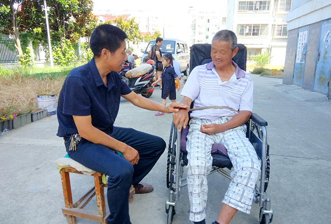 53歲的陳國軍原是淮海四分場(chǎng)社區(qū)農(nóng)機(jī)站的機(jī)駕人員,2004年秋季,因突發(fā)心臟病及血管方面的毛病,他在醫(yī)院里躺了一個(gè)多月才病愈;2006年,他病情復(fù)發(fā),搶救了16小時(shí)才醒了過來,從此不能從事重體力工作,每年要耗費(fèi)一筆不菲醫(yī)藥費(fèi)的他,被基層工會(huì)定為單位的建檔立卡貧困戶。不囿于貧困生活的他,自2005年開始,除期間到蘇州當(dāng)了一年半的超市保安外,其余的時(shí)間都是上門給行動(dòng)不便的老人做保姆,到目前為止,經(jīng)他服侍的老人已有22位,他在解決其他老年人頤養(yǎng)天年心愿的同時(shí),從而也讓他自己過上了一個(gè)靠自身勞動(dòng)獲得有尊嚴(yán)的生活。已經(jīng)有了經(jīng)濟(jì)來源的他,終于在去年摘掉了貧困戶的帽子,成為淮海走創(chuàng)業(yè)脫貧的典型。圖為陳國軍在為老人按摩、聊天時(shí)的鏡頭。