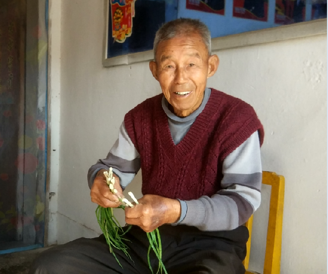 李朋友飲食比較清淡,少肉多素,油鹽也不多。每天下午2點左右,他會定時喝些兒孫們孝敬給他享用的腦白金、牛奶等營養品。每月有近7000元的工資,想買什么就買什么,那么多子女一個也不過問,只是由著他怎么處理,但老人從不亂花瞎用。老人很會做人,也會討兒孫們的歡心,每當他用存單積攢到6萬元錢時,就會6個子女一家1萬地均分,讓兒孫們貼補家用。李朋友對子女出手大方,教育投入上一點也不含糊,一定要他們練好書,學會技能,所以他的子孫都在自食其力地工作,這讓李朋友很是欣慰。當然,李朋友在兒孫中威望極高,逢年過節20多個子孫紛紛來到家中團聚,給老人帶來孝敬的物品,為老人請安祝福,讓老人的晚年生活充滿了快樂!圖為李朋友老人在做晾被栽菜和擇菜時的鏡頭。