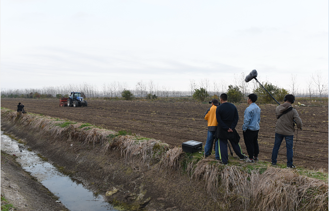 中央電視臺七套編導拍攝人員一行先后來到淮海農(nóng)場四五分場社區(qū)小麥播種的田間地頭進行拍攝,攝制組人員通過大場景、近景和特寫的鏡頭,實時拍攝大型農(nóng)機作業(yè)的整體景觀和中國北斗導航系統(tǒng)全天候智能化播種的鏡頭,同時還就改革開放四十年來就現(xiàn)代農(nóng)業(yè)的發(fā)展變化等話題采訪了農(nóng)場有限公司的相關(guān)管理從業(yè)人員。屆時,電視新聞將在中央電視臺第七頻道《大國農(nóng)業(yè)》系列紀錄片中進行報道。圖為中央電視臺七套農(nóng)業(yè)欄目組一行在淮海拍攝現(xiàn)代農(nóng)業(yè)時的場景。