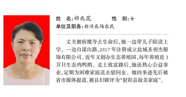 近日,傳來喜訊,祁兆花被評為第五屆“最美射陽人”。丈夫被病魔奪去生命后,祁兆花一邊帶兒子陪讀上學,一邊自謀出路,2017年注冊成立鹽城圣羽杰服飾有限公司。近年又創辦生態養殖園,每年養殖近3萬只生態雞鴨鵝。走上致富路后,她還熱心公益事業,定期為困難家庭送去慰問金。她的事跡被省市媒體報道,先后被評為鹽城市第二季“最美巾幗”、射陽縣“最美家庭”等。