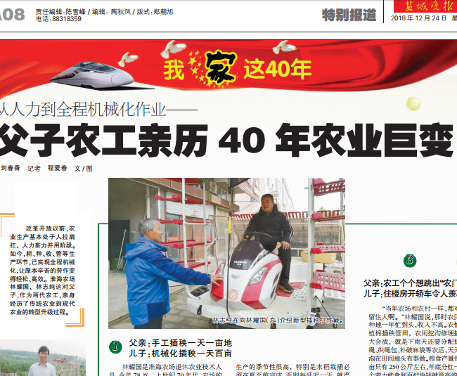 在12月24日出版的鹽城晚報(bào)第8版《我家這40年》欄目上,刊登了一篇淮海農(nóng)場(chǎng)社區(qū)劉春香采寫的《從人力到全程機(jī)械化作業(yè)——父子農(nóng)工親歷40年農(nóng)業(yè)巨變》文章,從父親林耀國(guó)和兒子林志純這對(duì)父子的對(duì)話中,來(lái)實(shí)時(shí)反映改革開放四十年來(lái)我國(guó)取得的偉大成就我農(nóng)墾發(fā)生的翻天覆地的變化,讀來(lái)令人印象深刻,并真切地感受到了改革開發(fā)以來(lái),發(fā)生在我們身邊的種種變化。以下是全文內(nèi)容。
