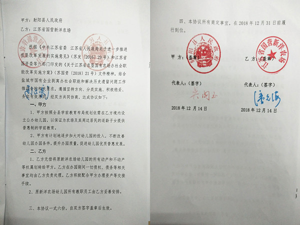 協議根據《中共江蘇省委 江蘇省人民政府關于進一步推進農墾改革發展的實施意見》和省國資委等六部門《關于江蘇省農墾國有農場辦社會職能改革實施方案》文件精神,結合鹽城市國有企業剝離辦社會職能和解決歷史遺留問題工作推進會要求,遵循堅持方向、分類實施、積極穩妥、務實有效原則,規定由縣政府按照全縣學前教育布局規劃依需在農場境內設立公辦幼兒園,保證為農場及周邊居民適齡子女提供普惠制學前教育,并逐年加大對農場幼兒園的投入力度,提升辦園質量和辦園條件。