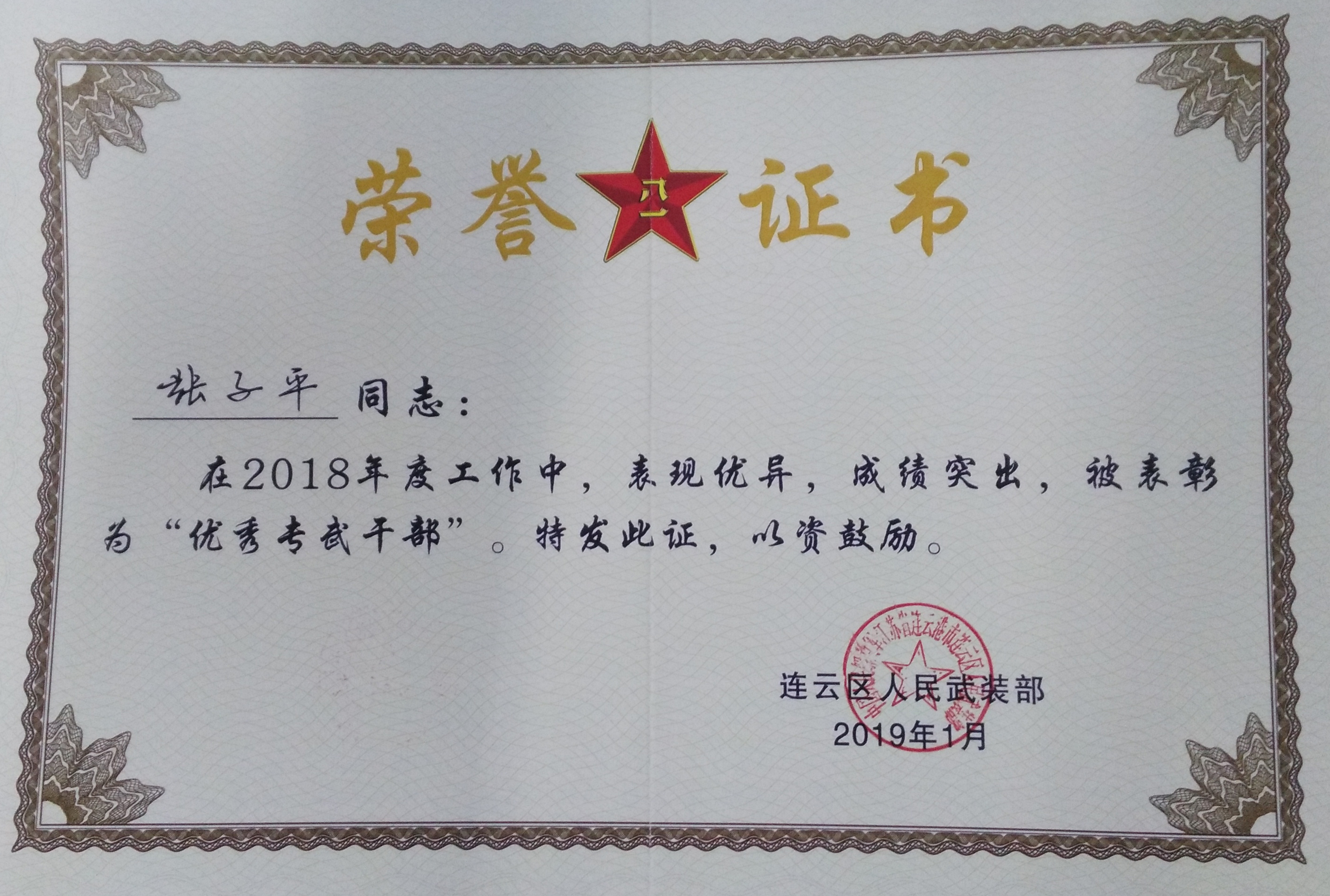 (圖為東辛農(nóng)場(chǎng)人武部部長(zhǎng)張子平獲評(píng)連云區(qū)優(yōu)秀專武干部證書)