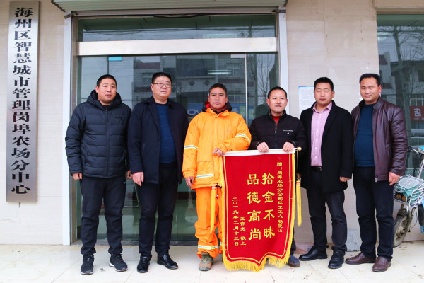 “感謝,非常感謝!”2月14日上午,家住東??h白塔埠鎮董園村村民王作亮將一面寫著“拾金不昧 品德高尚”的錦旗,送到了崗埠街道環衛辦環衛工楊祝山的手中,不停地表示感謝。