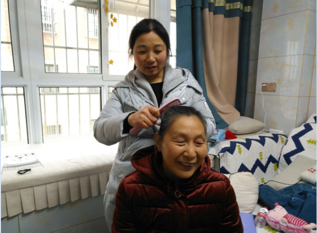 現在,只要街坊鄰居說起葉芹時,兩位婆婆總是搶著說:“能有這么個好兒媳,真是我們前世修來的福。”圖為葉芹在給婆婆梳頭剪指甲。