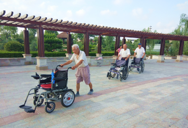 “我們每天坐在輪椅上來公園看看風景、聊聊天,生活也是很充實。當然了,推著輪椅車在公園里轉圈賽跑,也是我們自我加強體能鍛煉的一種活法,這樣的生活我們這些老頭都是感到很愜意。”三位老人一致地表述著。