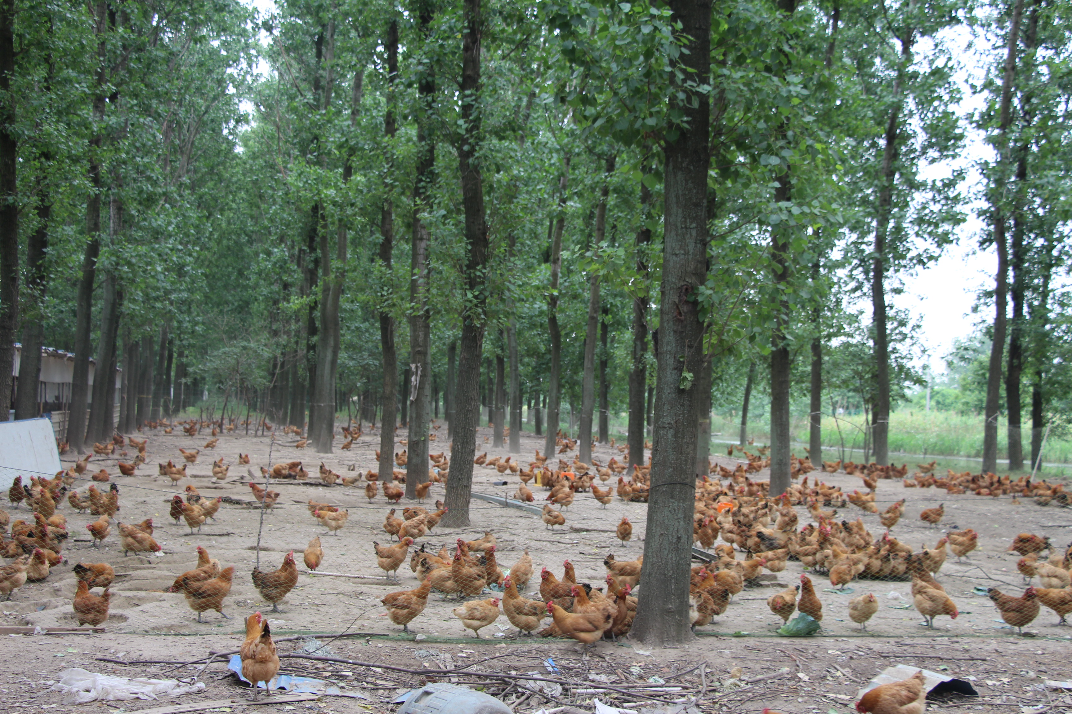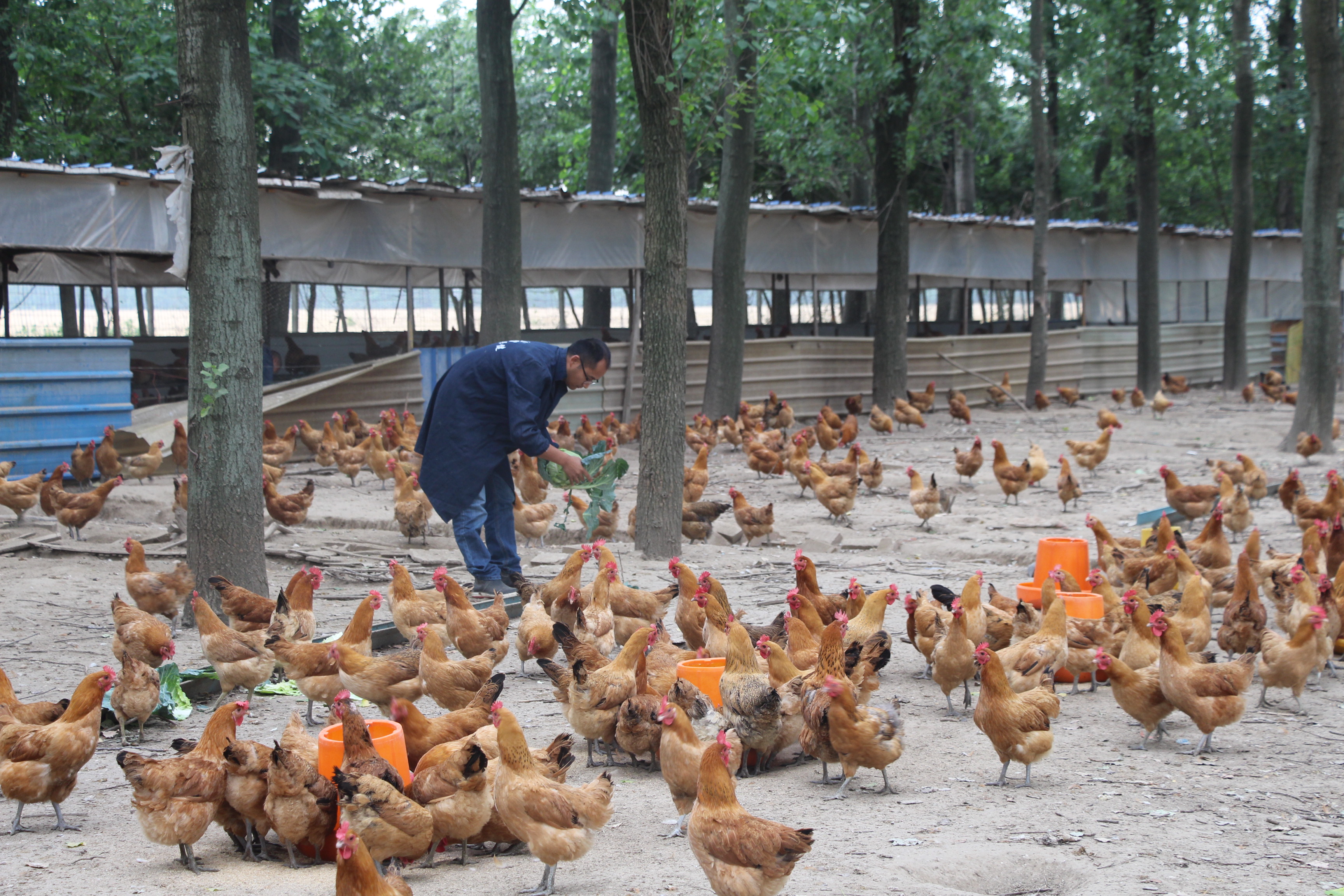 海安農場場部的南邊是農場三大隊,走進三大隊,一片樹林便映入眼簾,不遠處聽到連綿不斷的雞鳴聲,走近一看,原來是一個林下養雞場,雞場的主人是一位年僅36歲的年青人,他名叫田佳斌,來自如皋市江安鎮。