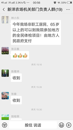 9月10日中午,新洋農場醫院院長林小東在公司負責人群里分享了一則喜訊,“今年我場非職工居民,65歲以上的可以到農場醫院參加地方的全民體檢項目,由地方人民政府支付。”標志著經過一年多的積極對接,農場公司終于爭取到部分人員全民健康體檢均等惠民政策,提高了居民群眾的幸福感和滿意度。消息傳出后,在全場范圍內起了很大反響。