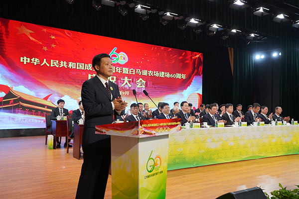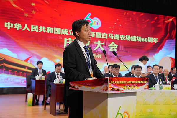 胡兆輝在講話中指出,建場60年來,一代又一代白馬湖人傳承和弘揚“艱苦奮斗、勇于奉獻、開拓創新”的農墾精神,櫛風沐雨、薪火相傳,形成了以種植業為基礎,種子為龍頭,育繁推、產加銷一體化經營、綠化林苗和水產養殖協同發展的現代農業產業體系;實現了綜合實力和發展質量穩步提升,城鎮面貌和生態環境持續改善,公共服務和社會治理水平顯著提高,職工群眾生活質量和幸福指數不斷攀升。