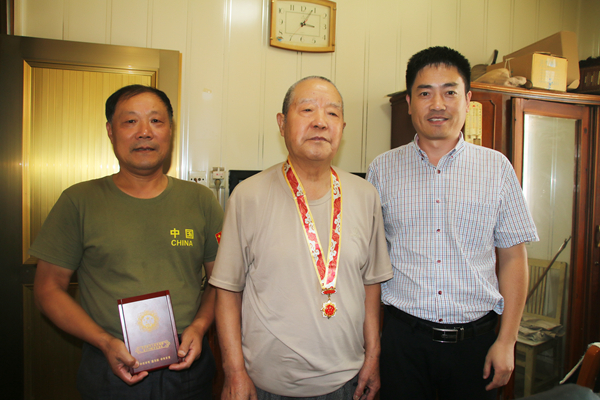 黨委書記陳守軍來到101歲的糜享祥老人家中,緊緊握著老人的手,感謝地說:“如果沒有像糜老這樣老一輩的努力奮斗,就沒有祖國的繁榮富強,更沒有我們如今的幸福生活!”并親自為糜老戴上了紀念章,仔細為老人講解紀念章的深刻含義,與百歲老壽星合影留念。