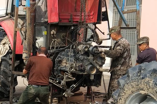 在淮海農(nóng)場(chǎng)神禾路東側(cè)一座平房前,我們見(jiàn)到有四名農(nóng)機(jī)修理師傅正在維修在三秋作業(yè)中出現(xiàn)故障的農(nóng)機(jī),多年以來(lái),他們四人一直以抱團(tuán)的形式開(kāi)了這個(gè)農(nóng)機(jī)修理點(diǎn),這對(duì)在三夏三秋中講究時(shí)間速率的農(nóng)機(jī)手們來(lái)說(shuō),收獲了許多農(nóng)機(jī)修理訂單,他們?cè)趲椭鷦e人的同時(shí),也讓自身獲得了不菲的收益。這四個(gè)人就是農(nóng)場(chǎng)原農(nóng)機(jī)修理廠李貴3兄弟和孫文貴等4人。