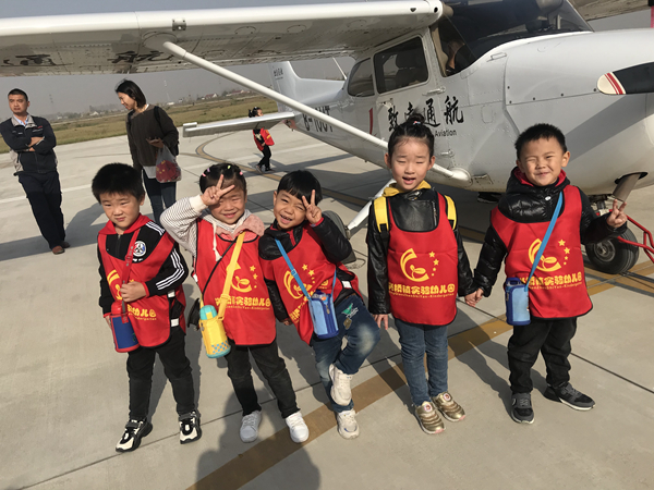 清晨,每個(gè)孩子帶著家中準(zhǔn)備好的太陽帽、水杯、濕紙巾、小零食興高采烈地,在老師們的帶領(lǐng)下登上去往射陽縣通用機(jī)場的大巴車,孩子們一路上歡呼雀躍、兒歌飄揚(yáng),不知不覺中到達(dá)了目的地。