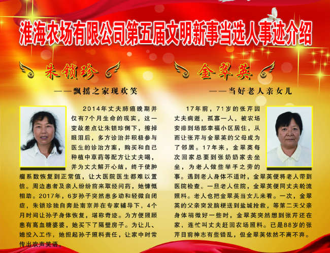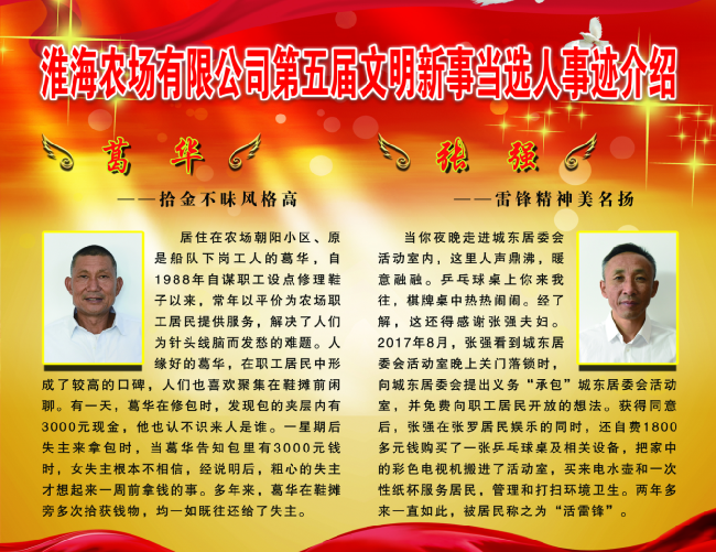 走進淮海農場有限公司機關大門,西側櫥窗上6名文明新事的先進典型赫然在目,細讀帶有他們頭像標志的文明新事事跡,讓人不僅產生了發自內心的感動。自今年第五屆文明新事在農場公司的第十三屆廣場文化節上表彰以來,做文明人,踐文明事,已經成為了農場公司職工居民的新追求。而舉薦和表彰文明新事活動,既是農場公司開展“不忘初心、牢記使命”主題教育的一項重要內容,也是全淮海上下學習先鋒先進、激發使命擔當的一項重要舉措。