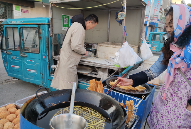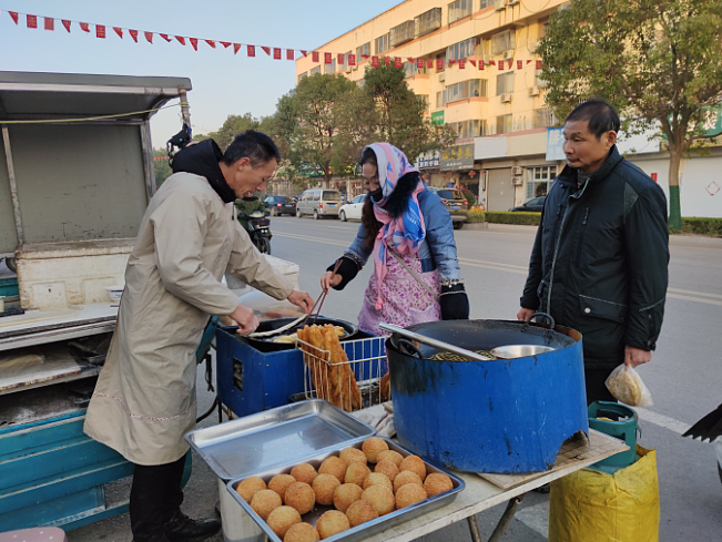幾個(gè)月前,當(dāng)姜建彪聽說以前一直在街頭制作油條麻團(tuán)的農(nóng)場(chǎng)職工徐傳彪打算改行要外出時(shí),姜建彪便找到他學(xué)習(xí)制作油條麻團(tuán)的技藝,并把他練攤用的車輛等家什盤了下來。早晨練攤,雖說起的早些,但不影響照顧老人和妻子打工。丈夫弄面食,妻子在一邊幫工,兼做收錢服務(wù)等工作。由于他們?nèi)寝r(nóng)場(chǎng)熟悉的職工,所以每天的生意也很紅火,大家也愿意照顧他們的生意,這讓姜建彪夫婦很是開心,更加激發(fā)了他們擺好攤子,服務(wù)大家的決心。