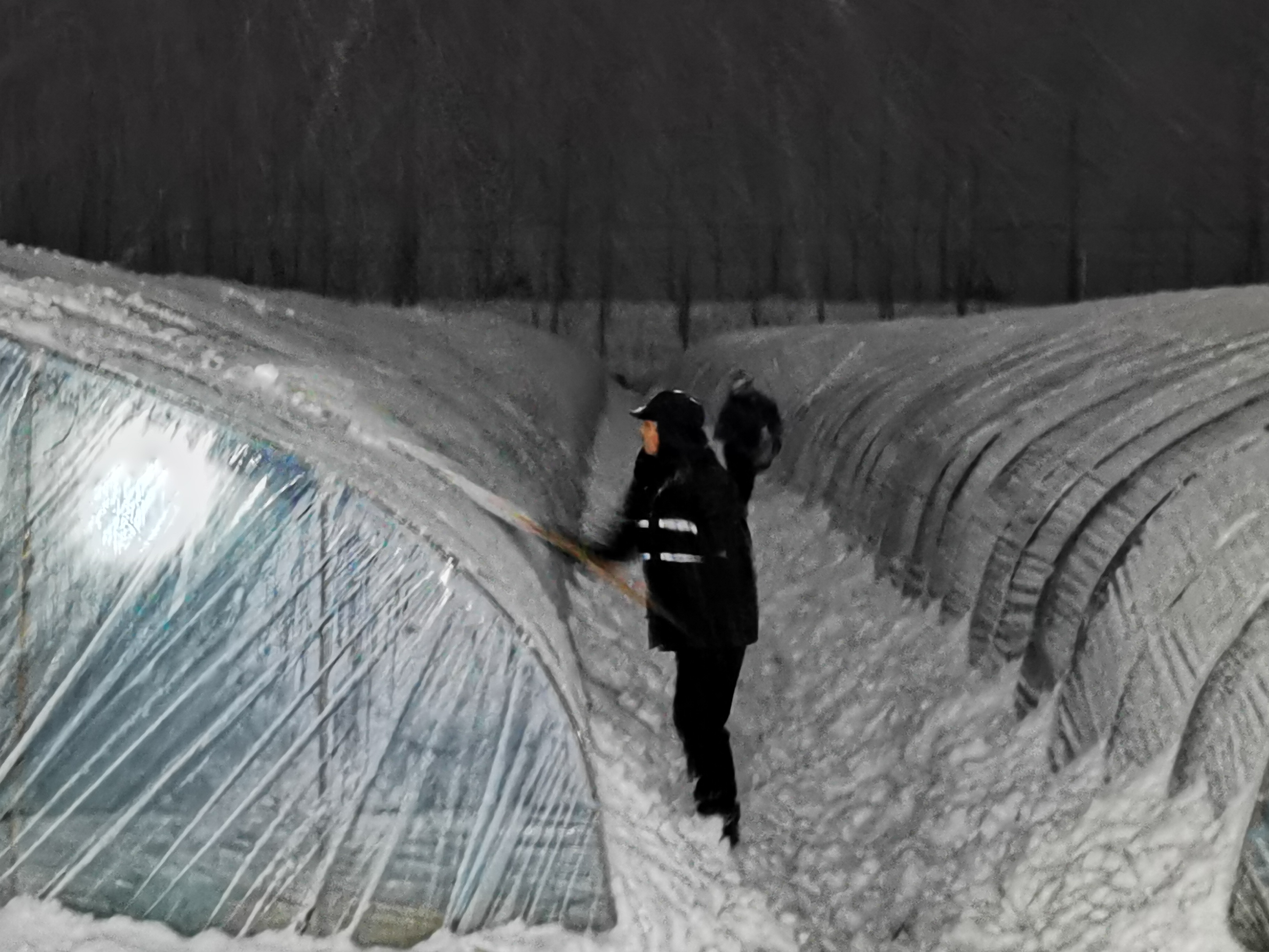 雪越下越大,剛清理的大棚上又覆蓋上一層雪。他們一刻不停,1人一個大棚,4人一組,四個大棚一起,從南向北,再從北回南,用力地敲打著大棚上的積雪。