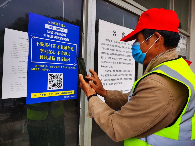 農場公司黨委工作部將通告精神錄制成音頻、編制成視頻,在廣播、電視、網站等進行宣傳,又制作宣傳掛圖50張、展牌4塊,出動流動喇叭17只在街道、集鎮、居民點進行巡回宣講,還組織文明志愿者、黨員青年,深入社區、居民點,指導職工居民通過掃碼關注“淮安云祭祀”微信公眾號網上祭奠,使在線祭祀緬懷先人成為寶應湖人的新時尚。
