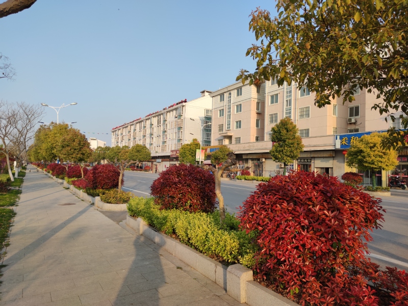 淮海路全長1000米,道路兩邊的綠化帶分別栽種的香樟、紫微、石楠球、石楠隔離欄等。如今,無論是站在淮海路的哪一處向兩邊望去,石楠的紅、石楠的綠,香樟樹的綠、香樟樹的黃,交錯在道路兩側,讓人感到其色彩明亮而莊重。特別是在陽光照耀明亮的日子、其路旁的色彩總是熱烈著,溫暖著心靈。樹木的色彩與周邊的建筑融合在一起,就如彩色的“調色盤”,為淮海涂抹著艷麗的色彩,從而也形成了淮海路中錯落有致的美麗景觀,讓大家置身在其中,感受到了春天那五彩斑斕,美不勝收。