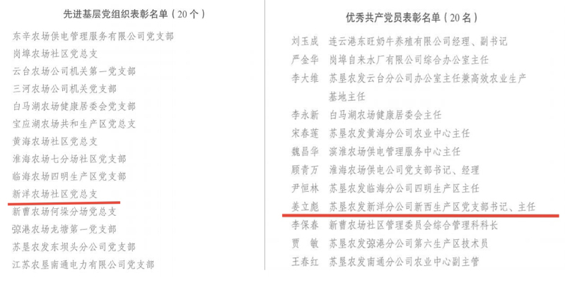 近日,在江蘇農(nóng)墾全面從嚴(yán)治黨工作會(huì)議暨巡察工作動(dòng)員會(huì)議上,集團(tuán)公司黨委表彰了江蘇農(nóng)墾優(yōu)秀共產(chǎn)黨員、優(yōu)秀黨務(wù)工作者、優(yōu)秀黨組織書記、先進(jìn)基層黨組織。新洋農(nóng)場(chǎng)社區(qū)黨總支榮獲江蘇農(nóng)墾“先進(jìn)基層黨組織”榮譽(yù)稱號(hào),姜立彪同志榮獲江蘇農(nóng)墾“優(yōu)秀共產(chǎn)黨員”榮譽(yù)稱號(hào),