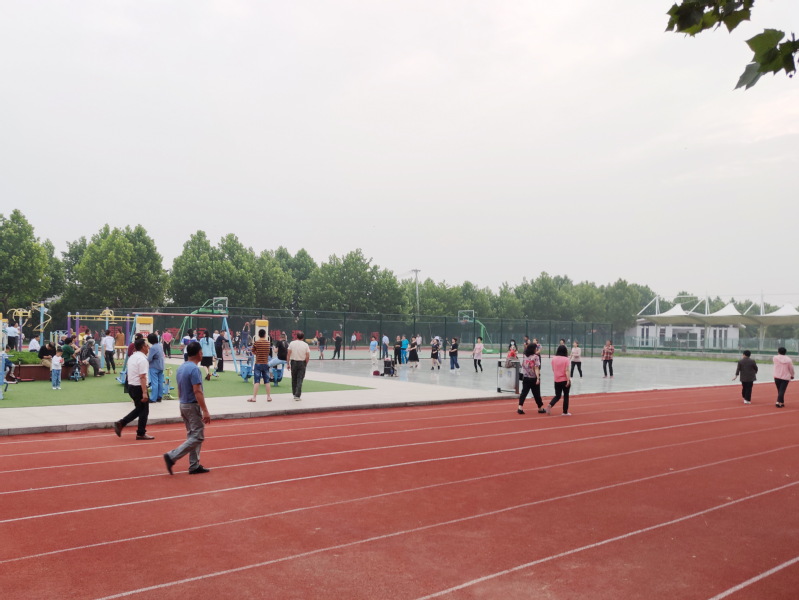 振興路茂密的梧桐樹下是一片清涼,透過“發展體育運動 增強人民體質”的紅色標語牌望去,職工休閑體育運動廣場上是人流如織,塑膠跑道散步、籃球場上追逐、門球揮桿運動、舞蹈池間翻飛、運動器材健身,人們在各自喜愛的平臺上運動健身,這是一幅和諧溫馨的生活畫面。筆者在淮海采訪,體驗著、回味著農場職工居民詩意般的社區生活,也近距離地享受社區居民愜意的一天。