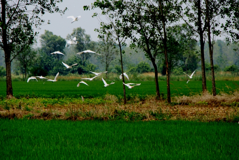 萬綠叢中點綴著點點白鷺,或而佇立田埂或田間,或而展開雙翅低低飛翔,動靜結合,給綠色的田野注入了生氣和活力。