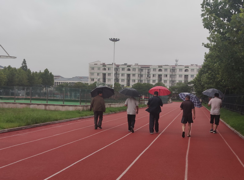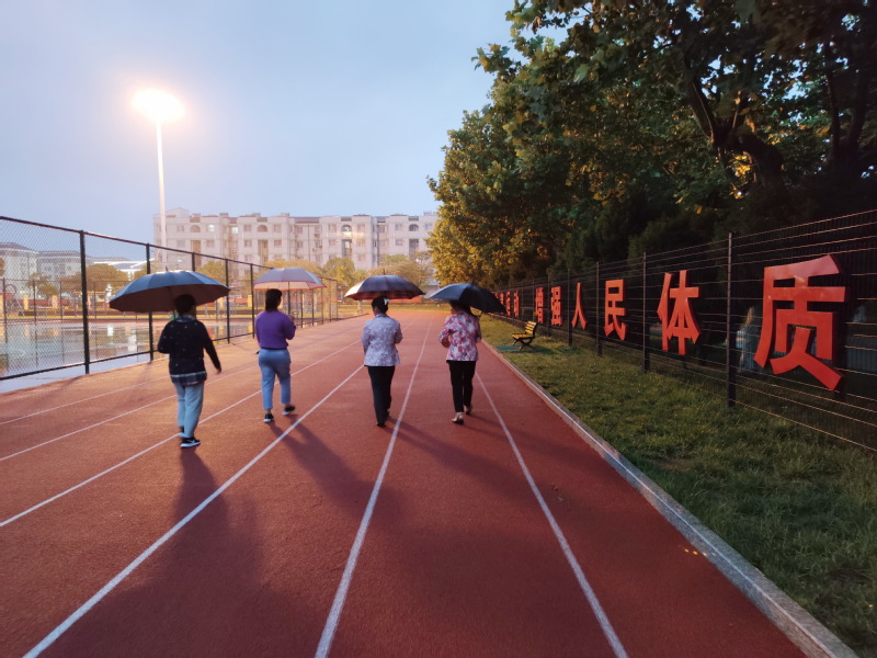 在淮海農(nóng)場職工休閑體育運動廣場內(nèi),這里不僅有多套的健身器材、漂亮的門球場、籃球場、舞蹈池,更有6-8步道的塑膠跑道,這種外圍是封閉室的跑道不僅帶給了人們安全舒適的健身環(huán)境,而且透水的柔軟、不積水的塑膠地面和漂亮的景觀,讓人們在體育運動廣場內(nèi)散步時有著很好的體驗,也讓職工休閑體育運動廣場很快就成為了農(nóng)場人氣最旺盛的廣場,成為職工居民每晚散步、跑步的地方。現(xiàn)在隨著農(nóng)場社區(qū)健康體育文化這張牌的打響,即使是小雨天氣,在廣場內(nèi)散步的也不乏其人。穿著球鞋在處在大樹樓宇包裹的廣場內(nèi)散步跑步,沒有洼塘積水的煩惱,沒有車流污水飛濺,你只要撐著一把傘,或是冒雨在絲雨中流連行走,也別有一番意境。