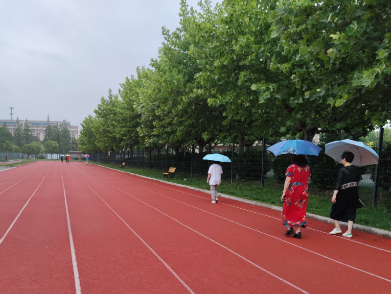 淮海的塑膠健身步道讓人既能享受就近健康體育文化帶來的愜意,又能不斷感受到農(nóng)場公共服務設施提升帶來的獲得感,這讓農(nóng)場社區(qū)越來越多職工居民熱衷健身跑這一行動以來,充分享受到農(nóng)場體育文化設施帶來的種種好處,這也是淮海農(nóng)場打造以“健康體育文化”作為淮海第五張文化牌的魅力所在。圖為人們打著雨傘在塑膠步道上散步時的鏡頭。