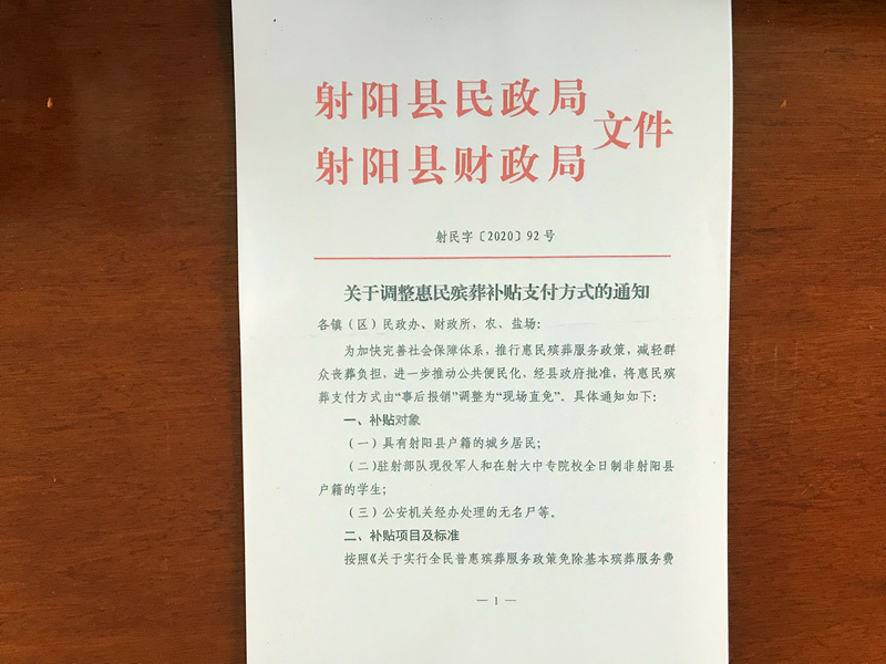 6月初,射陽縣民政局聯(lián)合射陽縣財政局共同發(fā)出的《關(guān)于調(diào)整惠民殯葬補貼支付方式的通知》(射民字[2020]92號)明確規(guī)定,為加快完善社會保障體系,推行惠民殯葬服務(wù)政策,減輕群眾喪葬負擔(dān),自2020年7月1日起將惠民殯葬支付方式由“事后報銷”調(diào)整為“現(xiàn)場直免”,新洋農(nóng)場居民同等享受該政策。