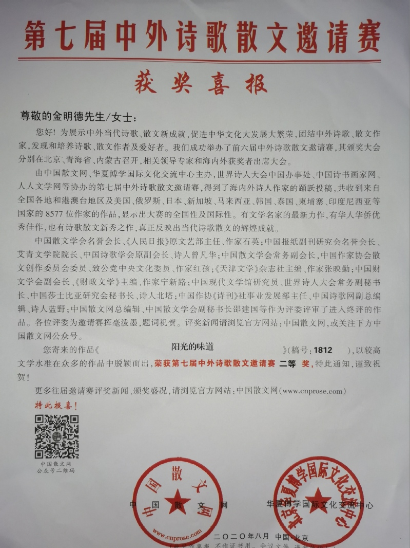 日前,筆者獲悉,原常州下放新洋農場知青金明德榮獲第七屆中外詩歌散文邀請賽二等獎。據悉,該比賽第七屆中外詩歌散文邀請賽由中國散文網、華夏博學國際文化交流中心主辦,世界詩人大會中國辦事處、中國詩書畫家網、人人文學網協辦。