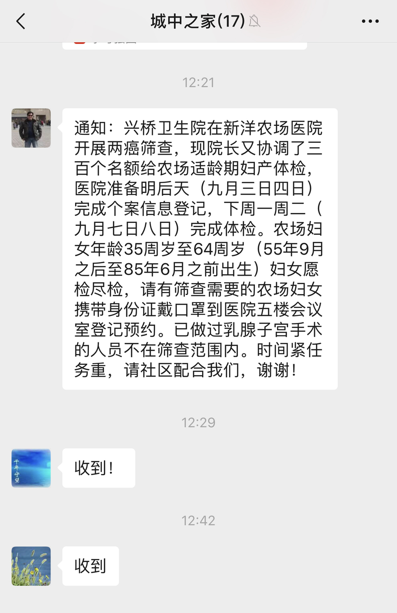 為確保適齡婦女都能享受到國家的惠民政策,社區相關部門向場域內適齡婦女宣傳“兩癌”防治知識,切實提高廣大婦女的自我保護意識,努力形成良好的篩查工作氛圍。此次農場婦女享受“兩免費篩查年齡在35周歲至64周歲(1955年9月之后至1985年6月之前出生)之間,興橋鎮衛生院新洋農場分院于93日至4日完成個案信息登記,9月7日至8日完成體檢。