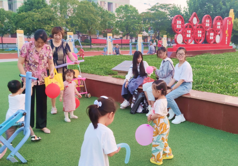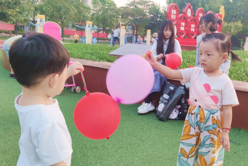 9月4日傍晚,在淮海農場職工休閑體育運動廣場健身器材包裹的橢圓形的大理石上,由淮海農場中學的三名學生正坐在上面一邊吹著氣球、一邊把色彩斑斕的氣球或是氣棒派送到前來索要的寶媽寶奶或是寶寶的手中,并以此來鍛煉體驗與社會交往的能力,并在人際交往中奉獻愛心,體味人性的溫暖。