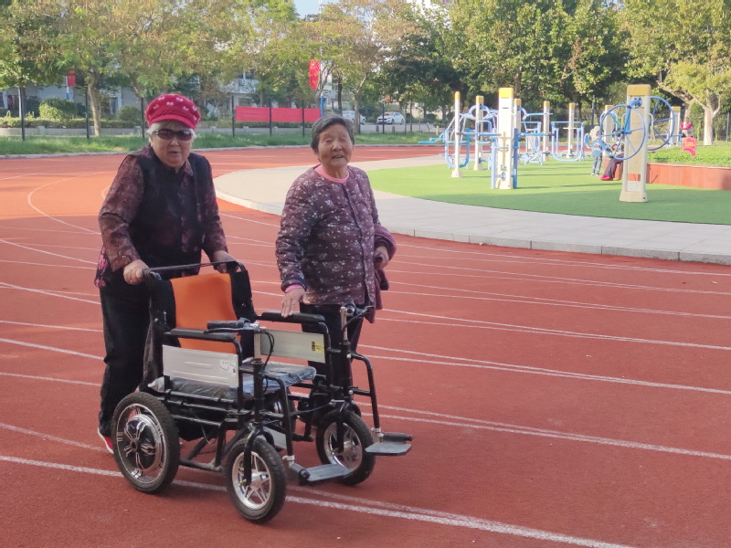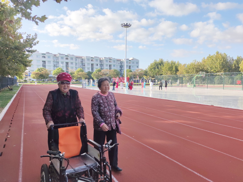 天上白云悠悠,太陽把藍天照耀得分外清爽;廣場內音樂陣陣,大家按照各自的健身規律進行著運動。我們注意到,有一個推著輪椅的老人和另一個老姐妹在相伴散步,瞧他們聊天的神態是那么的自然,交談起來甚歡。另外有兩個80多歲的老人,在塑膠步道上一圈又一圈的踱著步,以邁開腿的姿態進行健身。據這些都已經過了80歲的老年人講,他們每天都要來到廣場這里來走上七圈八圈的,這樣才能讓自己的身體時常充滿活力。