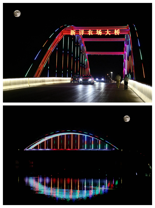 雙節來臨之際,新洋農場公司對大橋進行了裝潢,安裝了景觀燈,懸掛了“新洋農場大橋”橋名。經過工程技術人員的精心設計和施工,大橋裝潢工程如期精致完成,“新洋農場大橋”光彩亮相。雙節之夜,大橋霓虹閃爍,七彩紛呈,大放光彩,猶如彩虹落九天。天上圓月高掛,人間彩虹閃耀,天上人間遙相呼應,組成一道靚麗的景觀。