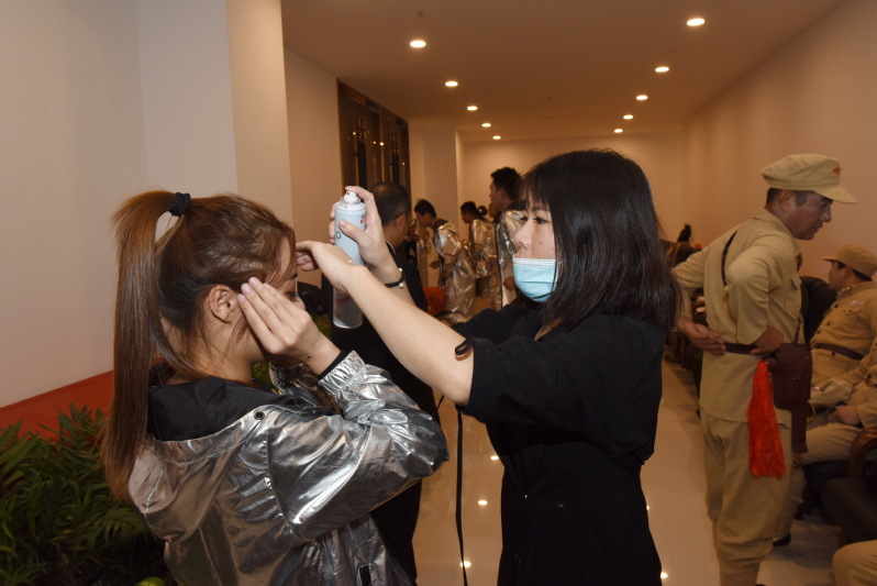 領舞的王超男,在舞蹈隊伍里扮演著輔助編排老師的角色,她在教練不在時,通過現場拍攝的視頻,一次次教大家統一動作,單個地提升每個隊員的肢體動作和語言,讓第一個人都能體會到劇中人物的情感并在上場前精心調理每一個出場人員的舞臺造型,力爭將最好的效果呈現給觀眾。