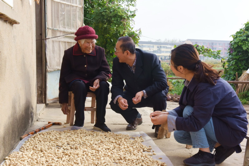 “老人家我們來看望您了。”淮海參加百歲老人慰問的一行人,當天上午首先來到位于城東居委會渠星小區邱維珍老人的家中,當他們看到老人正在門前分撿曬在地上的花生,一起圍著前去與老人打著招呼并噓寒問暖,并蹲在地上一邊陪著老人分撿花生,一邊與老人快樂地聊著。
