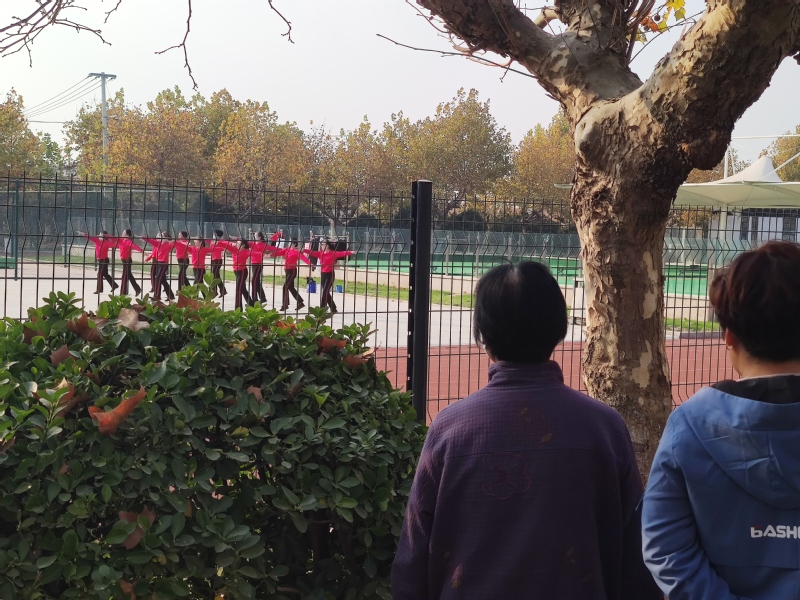 在淮海農場有多支這樣的文藝表演隊伍,他們就是通過文藝編排和創新,用自編自導自演的舞蹈節目,既是吸引了廣大職工群眾的喜愛,同時也帶動更多的職工居民加入到文藝活動中來,暢享著健身體育的美好!圖為路過的職工在柵欄外觀看淮海文藝表演隊編排的舞蹈節目。
