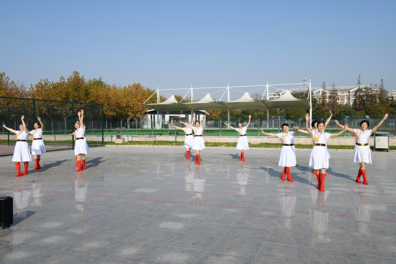 走進淮海職工休閑體育運動廣場中偌大的舞蹈池中,只見十多位穿著盛裝的大媽級的舞蹈愛好者們,正在一遍又一遍地排練著節目,他們不厭其煩地協調著舞姿、規范著動作,從他們認真的神態和一絲不茍的敬業精神中,讓我們感受到現場上的這支文藝隊對節目排練的認真程度。表演隊員們一會兒隨著領頭人的節拍,穿插表演著難度較高舞蹈節目的動作,一會兒跟隨著歡快的節奏,跳轉著輕快的步伐。他們統一的服裝和整齊劃一的動作,立刻就引起旁邊觀看職工群眾的喝彩,也給他們帶來的莫大的視聽享受。