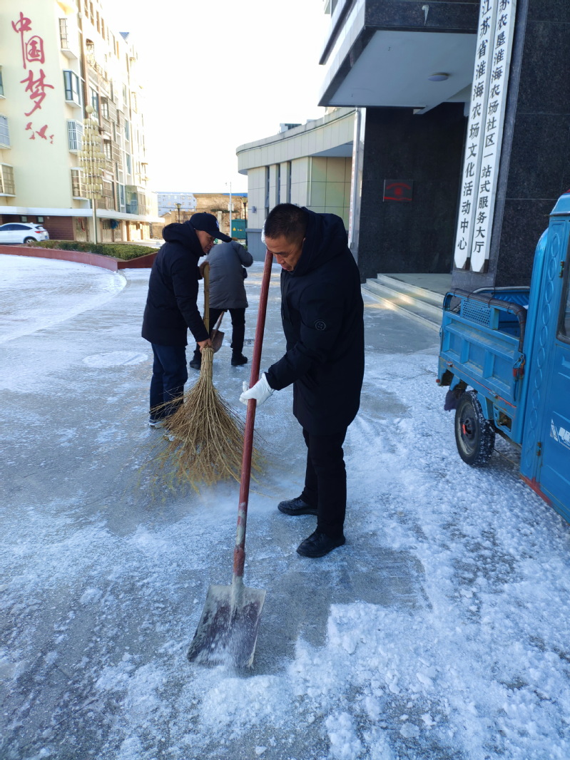 受降雪天氣影響,一場7級大風裹著一場大雪伴隨的寒潮侵襲了農場,特別是12月30日一大早,大門向北開的淮海農場社區門前已經被冰雪所籠蓋,道路結冰又不容易融化的社區門前容易滑倒的隱患凸顯,給前來辦事的職工居民的出行帶來了安全隱患。