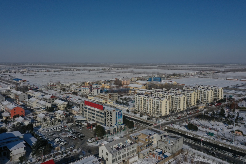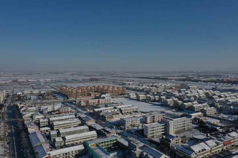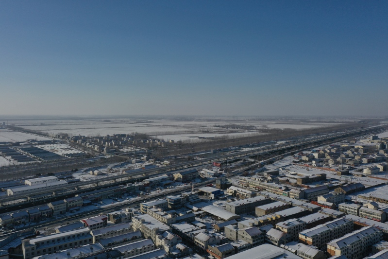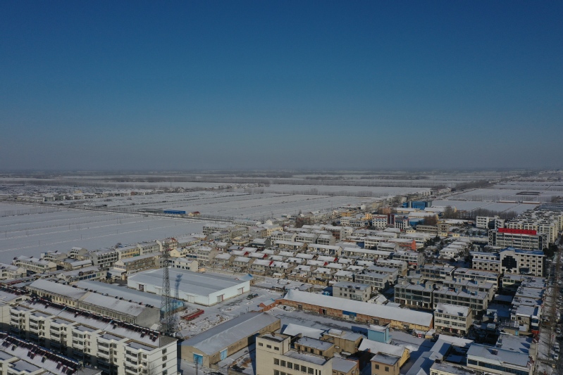 雪后初晴,利用無人機航拍記錄這一美麗的場景。只見崗埠農場小城鎮大雪過后一片白色的景象,到處是白雪皚皚,與藍天形成了強烈的對比,構成了一幅幅生動的藍天白雪圖。