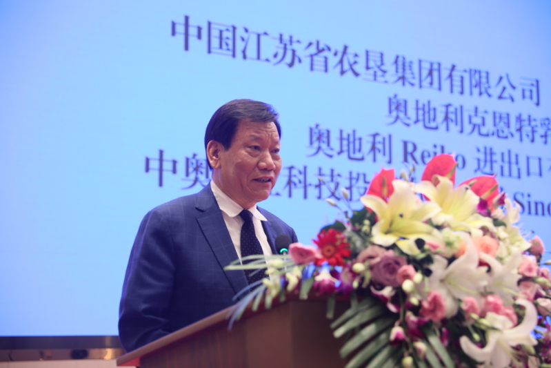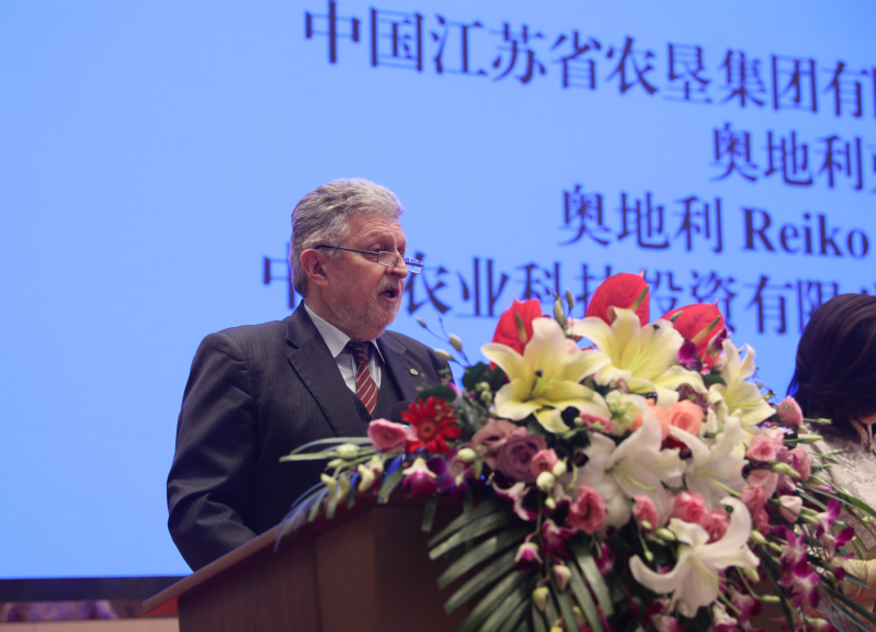 陳存根在講話中對合作框架協議的簽署表示熱烈的祝賀。他深情回憶了30多年前在奧地利學習生活的經歷以及后來在西北農大、楊凌農業高新區工作的情景。他表示,能夠見證中奧兩國在乳業合作上取得進展,十分高興,也圓了自己的一個夢想。他認為,中國是人口大國,吃飯問題永遠是頭等大事,中華民族5000年文明史就是一部農耕文明史。改革開放以來,中國最大的成就是從“吃不飽”到“吃得飽”再向“吃得好”轉變?!俺缘煤谩庇袃蓪右饬x,一是食品安全和質量上要綠色、有機、健康,二是食物結構要調整。今天雙方合作框架協議的簽署對改善食品結構、提升食品質量、讓中國人吃得更好具有長遠和現實意義。他表示,奧地利畜牧業高度發達,技術和產品質量一流,而江蘇農墾擁有政治優勢、資本優勢、資源優勢和市場優勢,合作前景廣闊。期待框架協議早日開花結果、落地生根,為中奧兩國食品產業交流和友誼作出更大的貢獻。