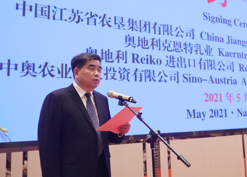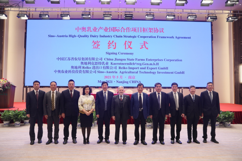 彼特勒對在江蘇和南京期間中方所給予的各種支持和幫助表示由衷的感謝,并介紹了中奧乳業國際合作項目的目標和理念。他說,中國各級政府和部門在“十四五規劃”中都特別重視農業問題,特別關注環保承受力和高品質的乳制品生產,既要長期應對滿足一個城市,一個區域,乃至一個國家人口對奶制品的供給側平衡,又要符合國際競爭中蓬勃發展的出口經濟的國際標準。江蘇農墾是一家卓越領先的大型國有公司,在開發新農業技術應用和管理系統方面擁有豐富的經驗,而奧地利克恩特乳業的新鮮原奶是被評為世界上品質最好的原料奶,生產約400個不同的產品。50年前的今天,中華人民共和國與奧地利共和國正式建立外交關系。他認為,國之交在于民相親,秉承相互尊重理解和支持的合作精神,今天的簽約儀式一定會為中奧建交50周年史上增添濃墨重彩的一筆。