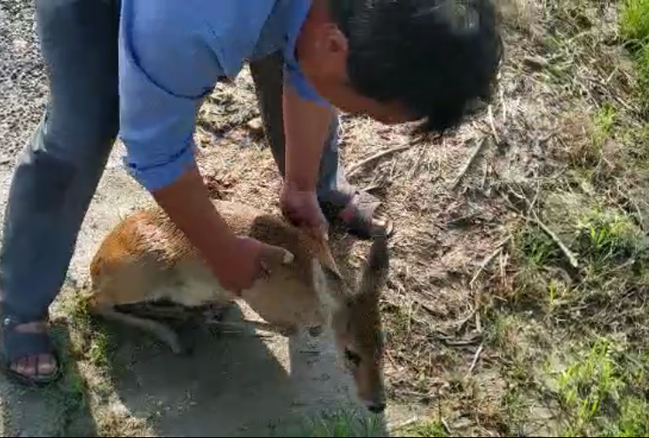 7月10日早上六點半,蘇墾農發弶港分公司第一生產區2連大渠正在抽水灌溉,2大隊隊長陳兵在田間踏田檢查時聽到渠道中有動物的叫聲,走近一看,發現一只獐在渠道里不斷掙扎,聲嘶力竭,隨時有生命危險。見此情景,陳兵立即組織人手拿來繩子、框子、網等工具,經過半小時的努力,終于成功地將獐搶救上岸。通過報警求助,警察連線咨詢了野生動物保護中心,在專業人士的指導下,陳兵對獐進行了簡單檢查和救護,發現野生獐沒有大礙,立即將其放生。