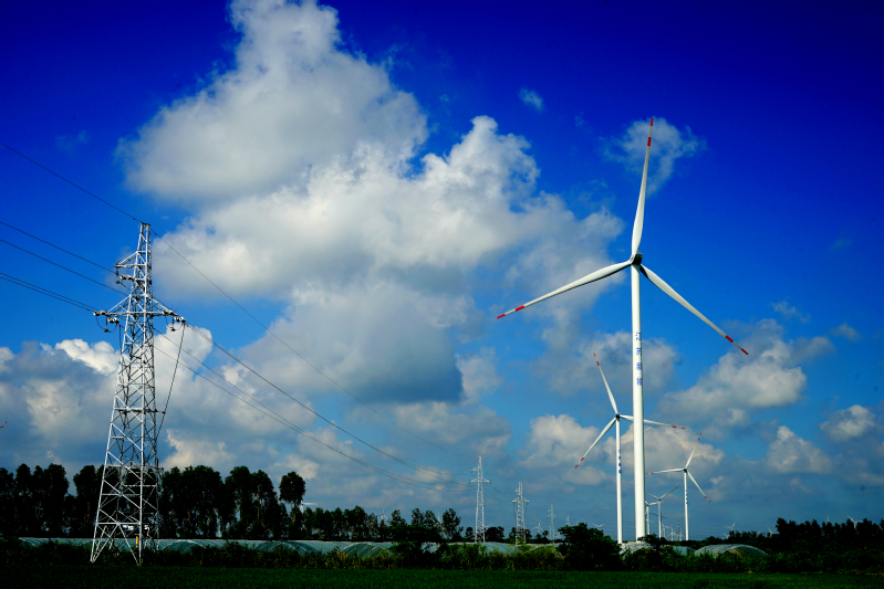 轉(zhuǎn)動(dòng)的風(fēng)輪,高高的輸電線鐵塔,鑲嵌在藍(lán)天與綠禾之間。