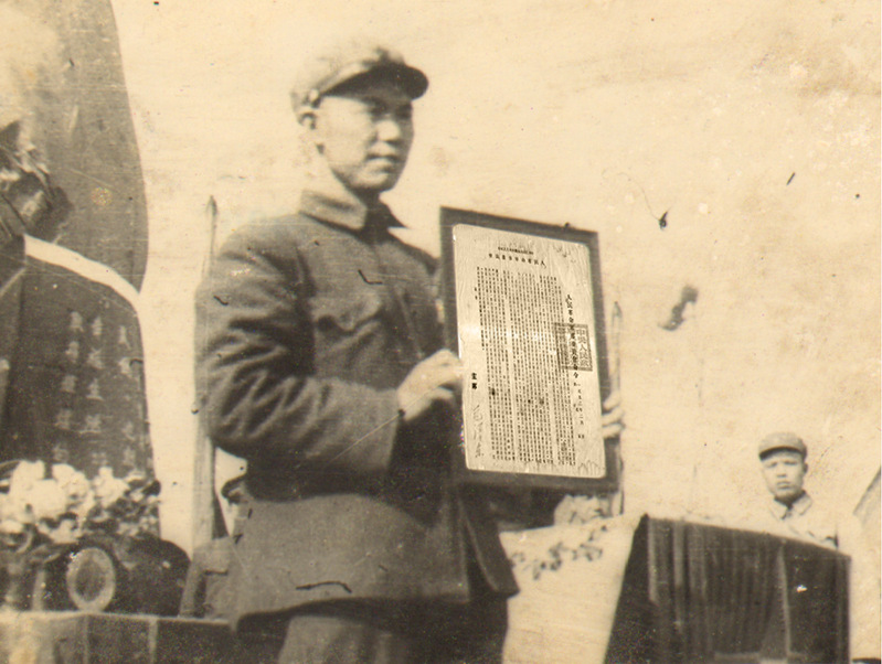 副師長李桂蓮從常玉清將軍手中接過命令,并代表全體官兵表示“堅決服從、堅決執行、作好生產準備,向生產戰線進軍”的決心。