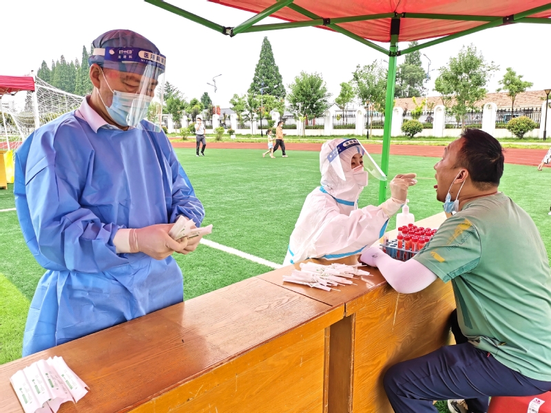 把廣場當(dāng)戰(zhàn)場,在團(tuán)結(jié)協(xié)作中恪盡職守。早晨五點(diǎn)半,居民們陸續(xù)趕來參加核酸檢測。只見徐加云一身藍(lán)色防護(hù)服,頭戴隔離面罩,手著橡膠手套,行色匆匆地忙碌在服務(wù)一線。指導(dǎo)掃碼、測量體溫、維持兩米線……看到需要引導(dǎo)的居民,他主動(dòng)上前做起引導(dǎo)員;遇到腿腳不靈便的老人,他連忙攙扶做起志愿者;碰到哪個(gè)點(diǎn)位需要人手,他自愿加入做起服務(wù)員。溫度迅速攀升,衣服早已干了又濕,他卻毫不在意。拿起消毒噴壺,他仔細(xì)地為采樣臺(tái)、醫(yī)用垃圾箱、人員等候區(qū)等處消毒。為縮短居民等待時(shí)間,加快采樣速度,他提前為醫(yī)護(hù)人員準(zhǔn)備好核酸檢測咽拭子棉簽。“我是迎湖居委會(huì)工作人員,這些都是我應(yīng)該做的,更何況我還是一名共產(chǎn)黨員,全心全意為人民服務(wù)是我的職責(zé)。”當(dāng)被問到辛不辛苦時(shí),他笑著回答道。歷時(shí)三小時(shí)十分鐘,迎湖廣場檢測點(diǎn)完成樣本采集1080份。核酸檢測高效率的背后,是徐加云的點(diǎn)滴付出,也是一個(gè)個(gè)共產(chǎn)黨員團(tuán)結(jié)協(xié)作的結(jié)果。