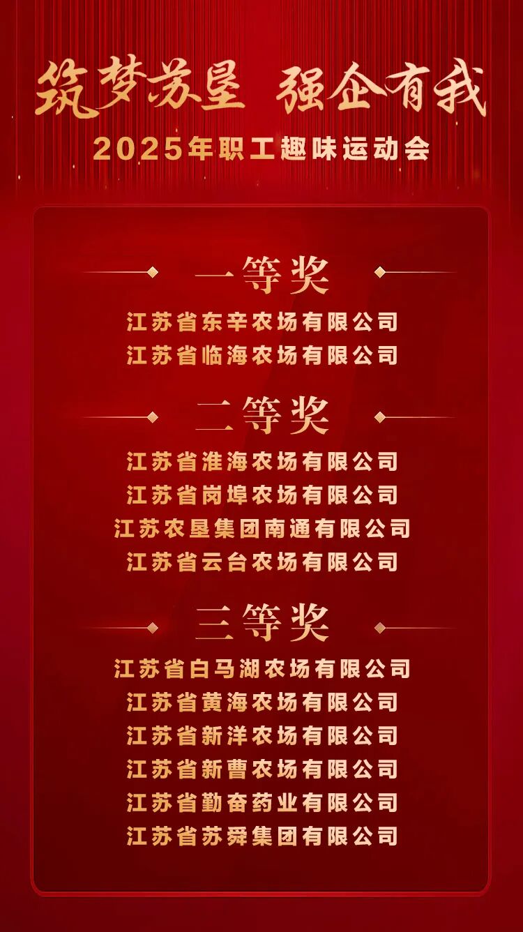 燃動金秋,趣享運動。10月19日,江蘇農墾2025年“筑夢蘇墾,強企有我”職工趣味運動會在寧成功舉辦。集團黨委書記、董事長吳本輝,黨委副書記朱浩,副總經理劉耀武,黨委委員、副總經理王立新,黨委委員、總會計師殷紅,黨委委員、副總經理劉衛華、鄧國新出席活動。
