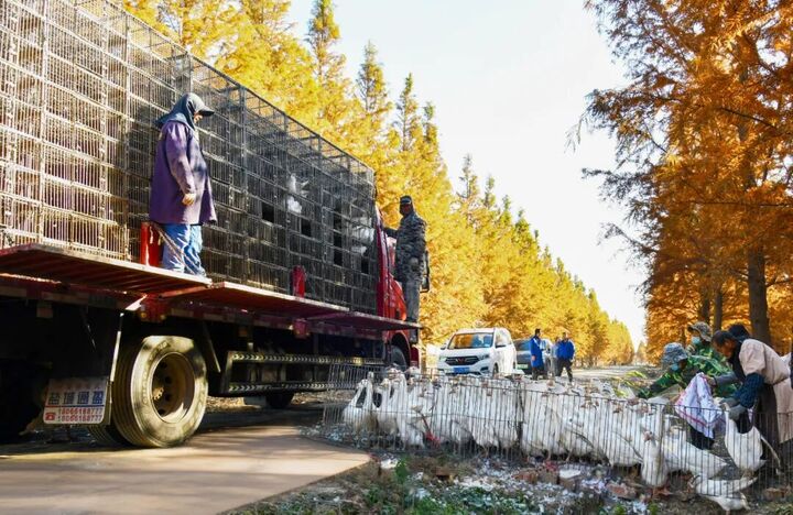 淮海農場肉鵝養殖基地內,運鵝車輛整齊排列,現場忙碌而有序。工作人員分工協作,攆鵝、抓鵝、裝籠,動作嫻熟,一氣呵成。這是淮海第三批生態肉鵝集中出欄,共3000余只,個個膘肥體壯,平均體重達到5公斤。由于品質上乘,一周前便被客戶預訂一空,即將直供周邊市場,成為大家年夜飯桌上的一道“硬菜”。該基地采用“林—草—鵝”循環養殖模式,將肉鵝散養于中山杉林間,以雜草為天然補充飼料。不僅降低了飼養成本,也有效解決了林下除草難題,同時為鵝群提供了充足的活動空間,減少了防疫壓力,也顯著提升了鵝肉的緊實度與風味。淮海肉鵝上市后,便成為周邊市民春節菜籃子里備受青睞的“綠色年貨”。