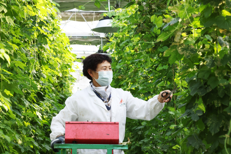 2月17日,云臺農(nóng)場興墾科技員工在整理啤酒花藤蔓(上圖)。2月17日,云臺農(nóng)場興墾科技工作人員在整理蝴蝶蘭育苗(下圖)。