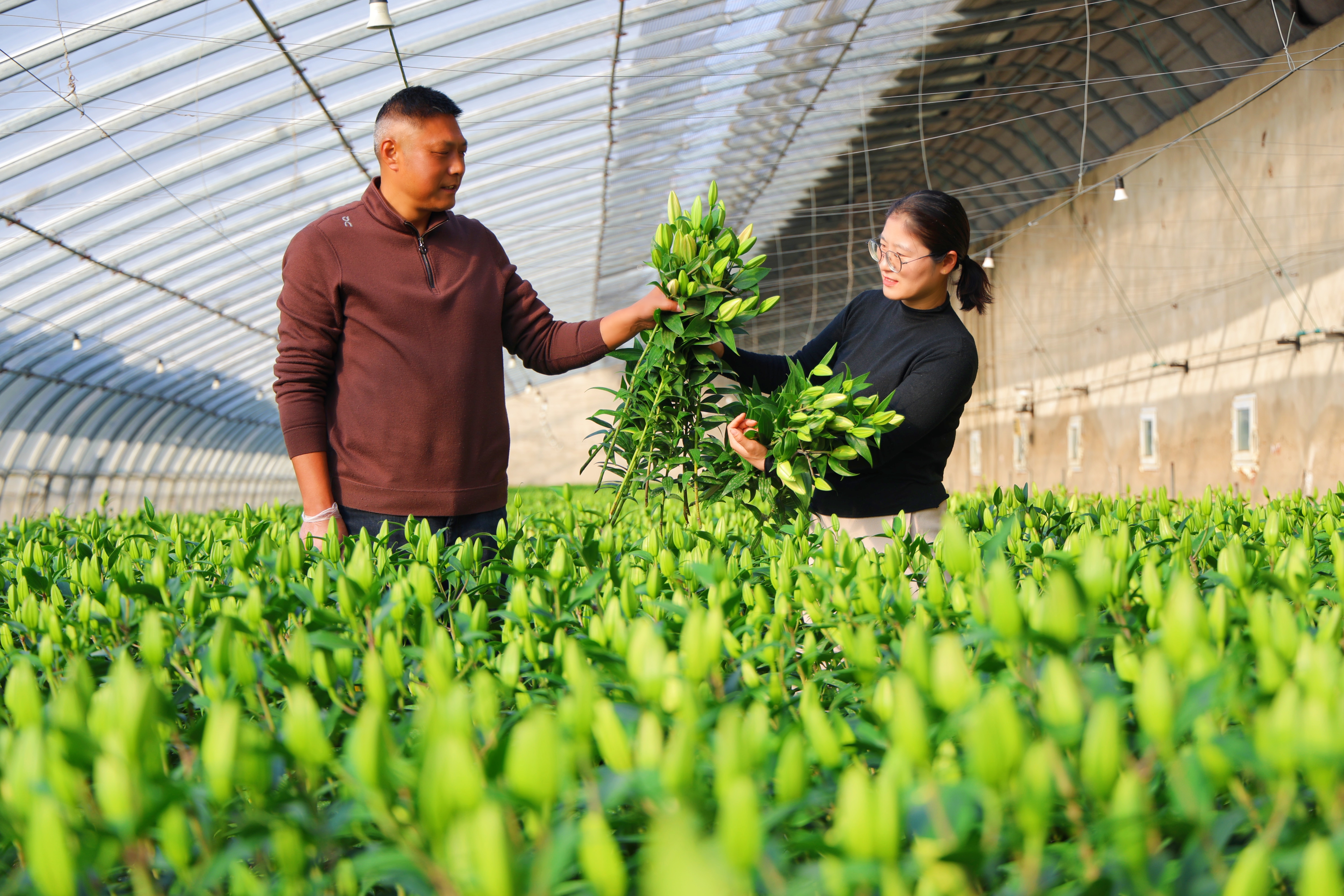 初冬時節,走進崗埠農場高效農業示范園26號大棚,一派繁忙而喜悅的景象映入眼簾,一株株百合花挺拔站立,不少已經露出了粉色的花苞,顯得生機勃勃。“要注意區分百合花苞數量,包裝時候要盡量保持花苞平齊。”11月24日上午,園區副主任魏建東正帶領著工作人員,認真地采收、分揀、包裝著首批成熟的百合花。此次采收的百合花品種名為“索蚌”,是園區于今年9月份精心栽植的。與傳統種植方式不同,26號大棚采用了“一球雙芽”的新種植技術,即一個種球培育出兩個芽苗,再進行種植。這一技術的應用,使得26號大棚僅種植了6000個種球,就達到了預期的種植效果,相比常規種植方式,種球用量減少了一半,節省了不少成本。“一球雙芽的種植方式,不僅提高了土地利用率,還增強了植株的抗逆性,使得百合花的品質更加優良。”魏建東說道。從目前的種植情況來看,“索蚌”百合花生長狀況良好,花苞飽滿,已經陸續進入成熟期。為了確保百合花的品質和市場供應的穩定性,園區在管護方面下足了功夫。從種植到采收,每一個環節都嚴格把關,確保每一朵百合花都能以最佳的狀態呈現在消費者面前。在園區的25號大棚,來自荷蘭簡懷特公司的百合種植專家拔起了一株百合花,仔細查